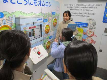 モノづくりの殿堂では、京都市に本社のあるモノづくりの企業16社の展示があり、それぞれに興味深い内容でした。緞帳や座席の生地を間近で見て触ったり、タブレット端末によるクイズがあったりと、子どもたちは目を輝かせていました。中でも、自分の感情を表す表情を読み取り点数化するコーナーや、いくつもの『ピーマン』を瞬時に計測する機械などのコーナーでは歓声が上がっていました。最先端のモノが京都市を中心に展開されていることに、子どもたちは改めてその素晴らしさを感じていたようです。