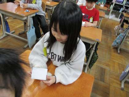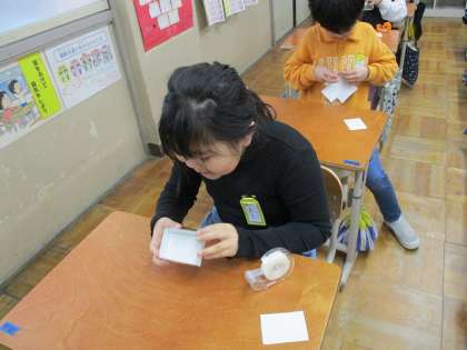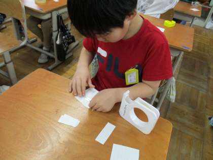 算数科「はこの形」の学習では、工作用紙を使ってはこの形を作りました。まず、面の形を6つ描き、切り取った面を、同じ長さの辺同士をくっつけて貼り合わせ、はこの形を作りました。2つ目のはこにも挑戦している人もたくさんいました。
