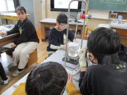 もうひとつ面白いのが、水を沸騰させて温度を測る実験。液体温度計を使って、沸騰するまでの時間とその温度を計測します。70度を超えるあたりからビーカー内に水蒸気の気泡がつき、そして90度を超えると沸騰する。温度はまだまだ上がり、97度から99度辺りで変わらなくなります。ご存じのように、水の沸点は100度です。では、うまくいったグループでも温度は99度までしか上がらないのか。それは、ビーカー内の水は100度まで達しているのですが、液体温度計のアルコールが上に上がるにつれて冷やされてしまうため。子どもたちは「ハンドパワー」を送っていましたが、100度までは至りませんでした。液体温度計がすっぽり入る大きな容器で水を沸騰させれば、お湯の中にすっぽり入っている温度計は100度になるはずです。少々危険ですので、機会があればということにしておきましょう。