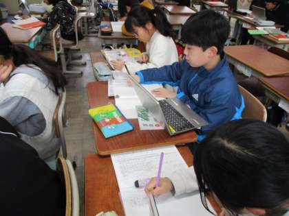 テーマに沿って、インターネット上のサイトや図書室の本などで調べています。それを、「初め」「中」「終わり」の三段落構成でまとめます。まず結論を書き、その内容を説明する。その時に引用を明らかにする。最後に、自分たちの正しい行動を呼びかける。このような文章作りに取り組んできた一年間でしたので、その成長を見られるのではないかと期待しています。