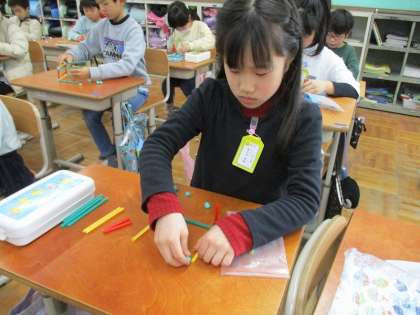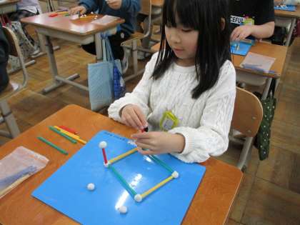 算数科「はこの形」の学習では、ストローと粘土玉を使って、はこの形をつくりました。ストローが辺で、粘土玉が頂点になっていることに気付いている人もいました。できあがったはこの形をよく見て、「1つの粘土玉から3つのストローが出ている!」と話している様子も見られました。