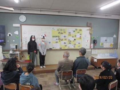 畑の先生をお招きして感謝の会を行いました。これまで学習したことをポスターにまとめたり劇にたりして発表しました。今年はお米づくりにご協力いただきました。お米作りは畑の先生方がおられなかったらでできなかったと思います。本当にありがとうございました。