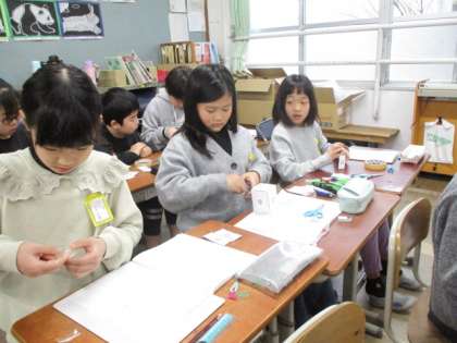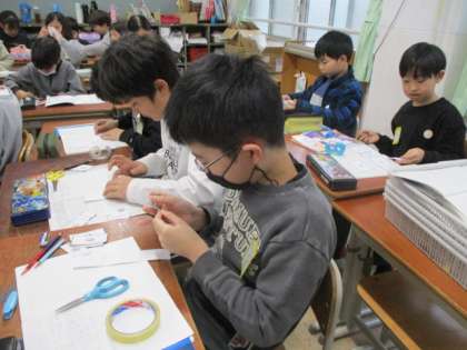 直方体と立方体の展開図や見取り図も書いていきます。ですから、面を貼り合わせて立体を作ったり、できた立体を開いたりして、手を動かす学習が結構あります。実際に作ることでその構造が分かり、展開図を書く際に役立ちます。こういう作業を見ていると、日常からいろいろなものを作っていることが、とても学習に効果を与えています。また、折り紙をしている子も早く理解してくれますね。特に、展開図を見て重なる辺や頂点を見つける課題のときには、折り紙の折り方と共通する部分があるような気がします。