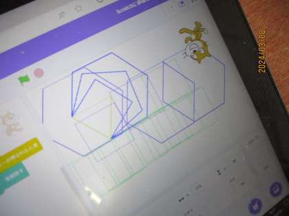 算数ではプログラミングの学習をしました。正多角形を書くためにどのような機能を入れたらよいか考えながら進めました。辺や角の数,角度などを考えることで図形が書けます。正多角形を使っておもしろい模様を作っていました。