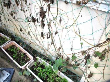 不思議なのが、西洋アサガオ。当然枯れて、蔓も干からびていることかと思いきや、緑色の葉が残っています。これはどうなるのでしょう。大部分の葉は枯れ、蔓も勢いを失っていますが、緑の葉数枚と頑丈な蔓も幾本か残っています。工事の防風幕の影響でしょうか。よくわかりませんので、見ていきたいと思います。