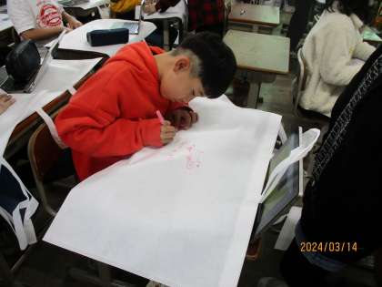 作品バッグ作りに取り組みました。絵をきたりクラスの友達からサインを書いてもらったりと自分だけの作品バッグにしていました。