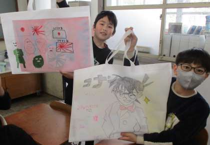 作品バッグの制作にかかると、1年間が終わりに近付いていることを実感します。4年生もすでに家に持ち帰っていることと思いますが、思い思いのキャラクターや風景、マークなどをアレンジして仕上げていました。たっぷり1時間かけてたのですが、まだまだ作りたいようで、持ち帰って制作する子も多くいました。