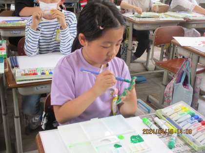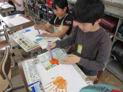 図画工作科の学習では、手形や足形を様々な角度で写しました。動物や花、魚などに見立てて作品を作っています。