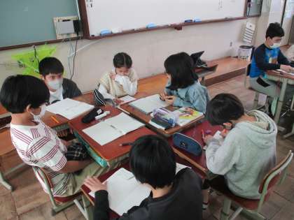 「つないで,つないで,一つのお話」という単元を学習しました。最初と最後の文は決まっています。そこからチームで一人一つの文章をつなげていきます。ポイントは前の人の話をよく聴き,話のつながりを意識することです。2回目をするとどのチームも上手に話を作ることができました。