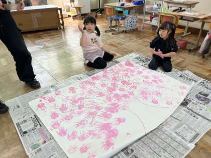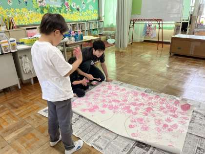 4月17日(水)の様子です。図画工作科の学習で桜の木を全員で作成中です。花びらを手形で表現し,その一つ一つに個性が表れる作品になりそうです。子ども達も絵具の感触に興味津々で,楽しく取り組んでいる様子でした。
