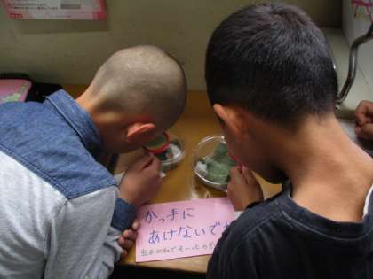 「動いてる!」「小さいなあ…。」「3mmくらいかなあ…。」子どもたちがかわるがわるのぞき込んでいます。キャベツの葉に産み付けられたモンシロチョウの卵から幼虫が孵化しました。キャベツごと容器に入れ、2階の踊り場に虫眼鏡と共に展示しています。