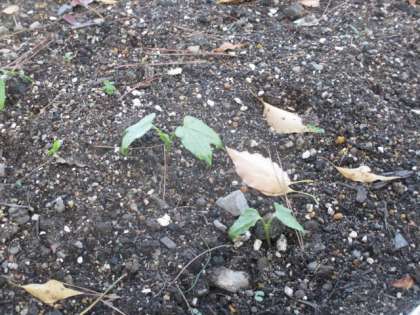 その横では、何やら見覚えのある芽が出てきていました。アサガオが芽を出したのだから、ヒマワリか? こんなに早く発芽したかなあ、と思いつつ、検索エンジンのレンズで確認。やはりヒマワリのようです。プランターの土をこの辺りに撒いたので、その中に混じっていたのかもしれません。まだまだ小さい葉ですが、これも成長を見守りましょう。