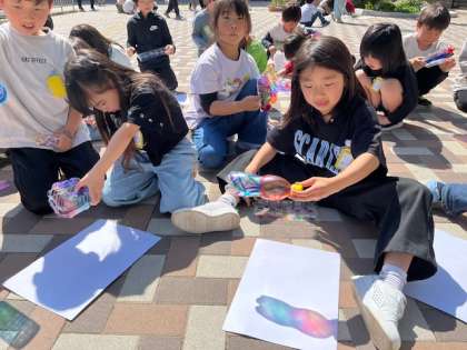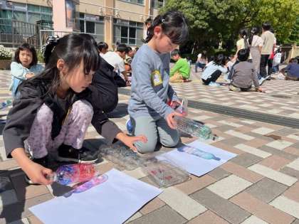 図画工作科の授業で透明の容器に色を塗りました。そして、日光を透すと、きれいな色が表れました。容器を動かしたり水を入れたりと、みんな大喜びで活動しました!