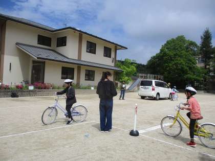 自転車安全教室では、正しい自転車の乗り方やルールを改めて学習しました。自転車に乗る前の点検や、動作の前の後方確認などわかっていても忘れてしまいがちなこともたくさんあったようです。改めて安全な自転車の乗り方を学び、学校外で自転車に乗るときにも生かしてほしいと思います。