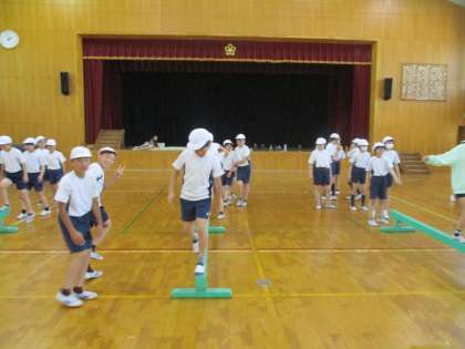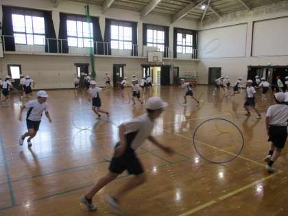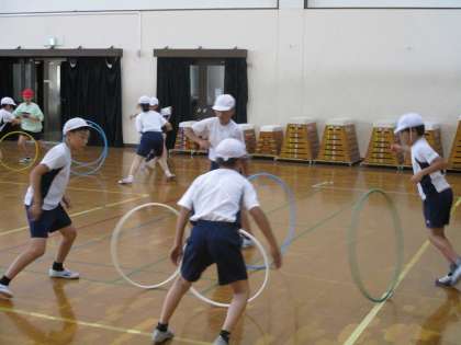 今日は平均台やフラフープを使った運動をしました。平均台ではバランスよくわたることができました。フラフープでは自分のフープを回している間に隣や2つ隣の友達のフープをキャッチする運動をしました。回すのも走ってキャッチするのも大変ですが,みんな必死に取り組んでいました。