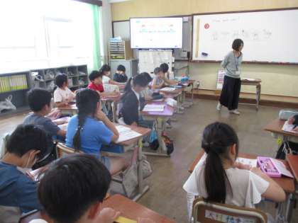 今回もほぼ全員が「Good!」「Fine!」「Hungry!」という返答でした。歌は2年生の時にも歌った曲。みんなで体も動かして大合唱になりました。友達同士で「How are you?」と聞き合う場面では、多くの友達とやり取りしようと教室内を動き回って活動します。体の動きも交えての返答で、笑顔があふれていました。