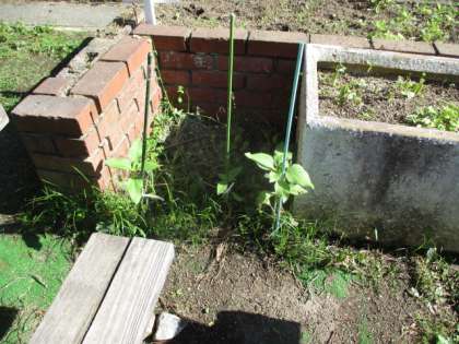 こぼれ種で勝手に生えてきたのは、昨年2mにもなったロシアンヒマワリが咲いていた場所。しっかりと大きな苗が、イタドリなどを抜いた後から顔をのぞかせました。支柱に結わえて、倒伏を避けます。こちらの栄養分は、抜いた草を上からかぶせるだけ。さて今年はどのくらいの大きさに育つでしょう。
