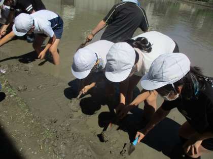 めいとく学習で、あぜぬりを行いました。田んぼのどろをあぜの上にあげて、塗ることで田んぼから水がもれるのを防ぐために作業をしました。初めて田んぼに入って、とても楽しそうに作業していました。