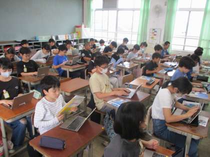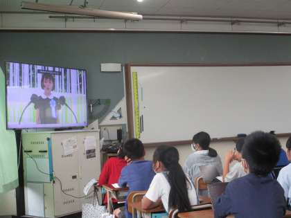 平和の誓いの文章を考えました。初めに沖縄の慰霊祭でスピーチをした2年生の動画を見ました。その様子を見て自分が調べてきたことを書き起こしていきました。