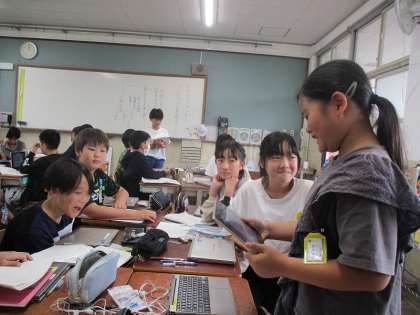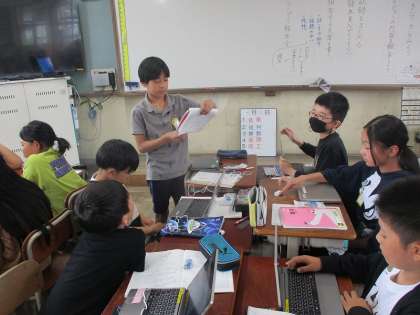 国語科「きいてきいてきいてみよう」の学習では、インタビュー内容を整理して報告会をしました。録画した動画を見返して、メモをつけ足してほかのグループに報告しました。聞き手と話し手のやりとりを正確に聞くことを大切に、一生懸命聞いていました。