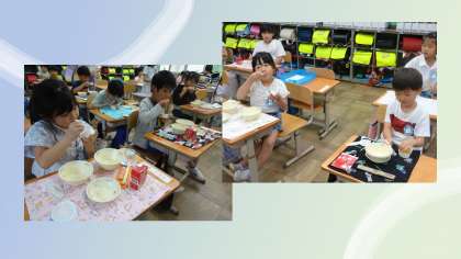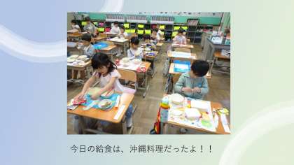 今日の給食は、沖縄料理でした。パインゼリーがおいしかったようです。