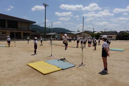 前回の学習から歩数を変えてみたり、少し高めに設定してみたりとそれぞれ考えて活動していました。なかなか跳べない子には「ここで足を上げてみて!」「「歩数が違うよ!」とお互いに見て思ったことを伝え合いながら学びを高める姿が見られました。