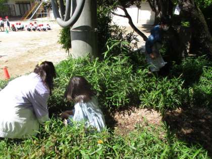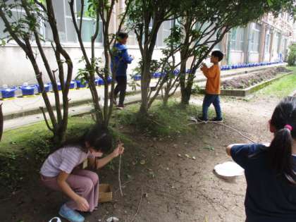 石やブロック、木の枝やロープ、そして木の実。見つけてきたものや用意されたものを駆使して、お好みの場所で組み立てていました。飼育小屋の周囲や中庭、玄関前の植え込みを利用している子もいました。ちょっとした隙間に木の枝で組み立てたり、木と木をロープで結んでツリーハウスのように見立てたり、発想の豊かさに驚かされます。出来上がった「すみか」をPCで撮影し、作品の完成。みんなが使う校内ですから、元通りに戻しますが、少し名残惜しそうでした。