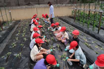 朝一番からさつまいもの水やりに行ってきました。「最初の3日間が肝心だよ。」と畑の先生から教えていただき子どもたちもやる気いっぱいの様子で「朝ごはんだよ〜」と言いながら水やりをしていました。