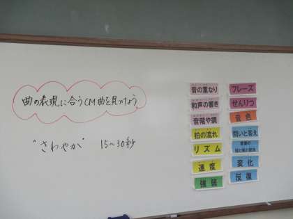 曲の表現に合うCM曲を考えました。CMに使われている曲も何をイメージさせたいのかなどを考えながら使われていると思います。色々なCM曲を友達と探しながら学習を進めました。家でもCM曲に注目してみてください。
