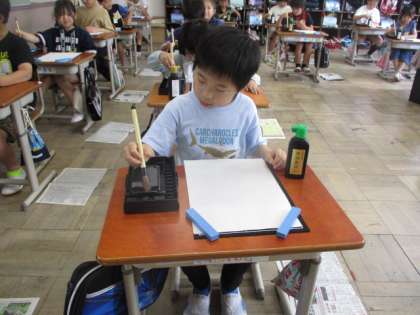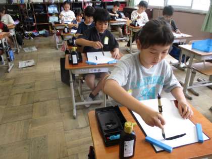 初めての毛筆の学習で大切にしたことは、まず手を汚さないこと。手に墨が付くということは、気をつけないで書いてしまい、そのうち遊びのように書いてしまいます。そして、姿勢。今回は腕。特にひじの上がり具合です。太筆の場合、ひじは手の位置まで上がります。肩の力が十分でない3年生のとっては、けっこう難しい姿勢です。それでも最初に十分意識をつけておくと、これからも気をつけるようになります。食事の時にお茶碗を持ち上げて食べることと同じですね。ひじを上げられるようになると、自然と背筋も伸び、姿勢もよくなります。あとは、筆を持つ位置でしょうか。これは微妙なバランスですので、子どもによって変わってきますが、あまりにも下を持っていたり、上の方を持っていたりすると、もう少し上下するように指導しています。定位置がわかるのは、もう少し先のことと思います。