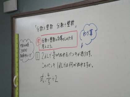 今日は分数÷整数の問題に取り組みました。問題文から式を立てることから難しいですがよく問題を読むことが大切です。この学びは次の単元に使います。しっかり力をつけよう!