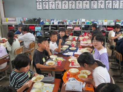 今日はプリプリ中華炒めでした。いずら卵が復活していて子どもたちは大盛り上がり!授業を身に来てくださっていた先生とも話をしながら楽しく食べました。
