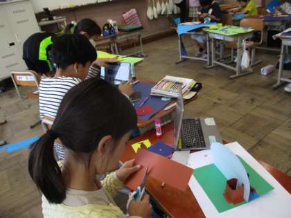 まずは、わりピンというものの紹介。雑誌の付録などによくついていた記憶が私たちにはあるのですが、初めて触る子どもたちも多く、珍しがっていました。何を回転させるか、いくつかの作品を見ていろいろとアイデアを巡らせます。立体にするか、平面にするか。作品によって異なり、出来上がりを想像しながら部品を切り取っていきます。人の腕の部分を回転させる子、人そのものを回転させる子。そして、場面そのものを回転させる子。作品の物語を考えながら、試行錯誤です。一度あけた穴にわりピンを通し回転させてみて、思い通りに行っている子もいれば、ちがう方法に挑む子もいます。