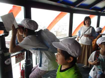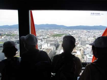 タワーの展望室からは、京都市街地を取り巻く三方の山並みが象徴的です。まっすぐ伸びる烏丸通の先のやや東寄りに五山送り火の「妙」の文字。その山の向こうに岩倉があり、自分たちが住んでいる街と京都市街地の広さの違いも、展望室から見ることでわかったのではないでしょうか。この季節は空も霞む日が多く、遠くまで見渡せないものですが、この日は幸いにも視程が良く、南西方面にビル群が確認できます。大阪です。梅田のビル群のやや左にひときわ高いビル。あべのハルカスです。京都からおよそ50km。「向こうからもこちらが見えるのかなあ。」という感想も聞こえてきました。機会があれば見に行きたい所ですね。
