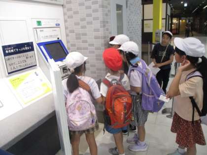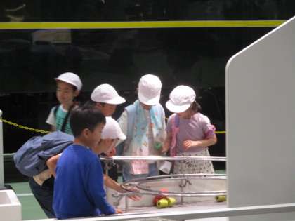 早めに京都鉄道博物館へ。そこでは班行動です。各班に一つずつ腕時計を持って、集合時刻まで自由に学習します。鉄道の様々な仕組みを、いろいろな体験で学習できる仕組みがたくさんあります。踏切やパンタグラフなど、動かしてみてわかるものに興味があるようです。切符を券売機で発行するシステムや、自動改札を切符が通る仕組みなどを体験できる場所が人気でしたね。そういえば切符が磁気式からQRコードに代わるという報道も、先日ありました。技術の進歩で、この体験もいつか昔話になってしまうのでしょうか。変わらないのが蒸気機関車の迫力。音や煙に圧倒されるのも当然ですが、内部を実際に見て、蒸気の力の強さに驚かされます。黒光りする巨大な物体が、石炭の火力で水を沸騰させ、その圧力で動くという仕組み。子ども達はどのような感想を持ったのか、聞いてみてください。