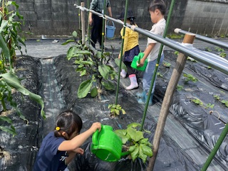いいお天気が続いているので、朝一番にめいとく農園の野菜たちにお水をあげにいきました。「おいしい?」「のどかわいてた?」声をかけながらお水をあげる星の子のみんな。やさしい気持ちもふりそそぎ、きっとぐんぐん育ってくれると思います。