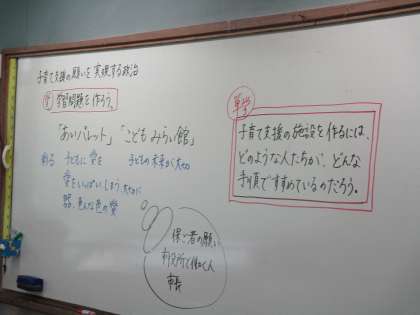 政治と子育てがどう関係しているのかを調べ,学習問題を作りました。子どもの立場から考えられることはたくさんあると思います。いい考えが出てくることを期待しています。
