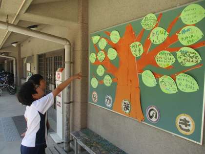 体育館前にある「なかまの木」を見ています。人権児童朝会で取り上げられたテーマについて各クラスが書いているキーワードを見て,話し合っている様子が見られました。いろいろな考えがありますね。