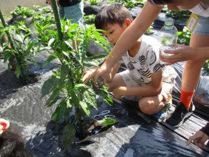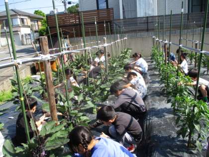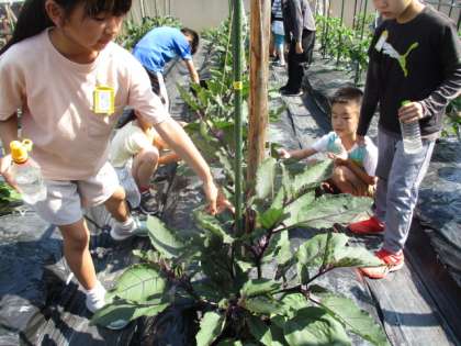 「まだ赤ちゃんや。」これは、万願寺唐辛子の株を見ていた子から出てきた言葉です。万願寺唐辛子は着果して間もないようで、大きさは小指ほど。これからすぐに食べ頃となるでしょうが、もう少しですね。「花がいっぱい咲いている。」「賀茂茄子にも花がある。」このような状況ですので、これから1か月間、順番に持って帰れるようになることでしょう。