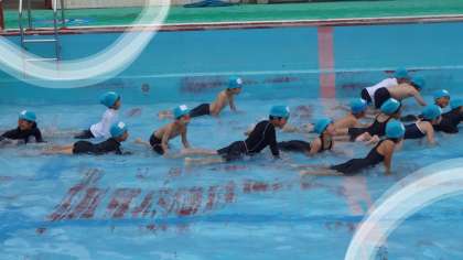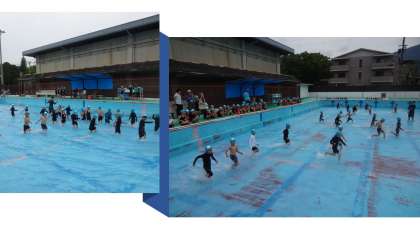 初めての水遊びでした。バディーで安全確認や忘れ物がないかを点検し合います。水遊びのルールを守って楽しく低水位での「水遊び」の学習をしました。「わに歩き」や「かに歩き」「かけっこ」などをしました。