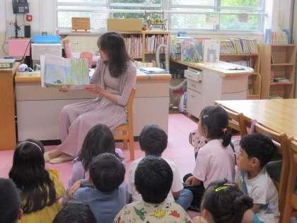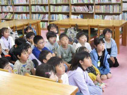 「スイミー」と同じタッチの絵を見て、子ども達はワクワクした様子で読み聞かせを聞いていました。