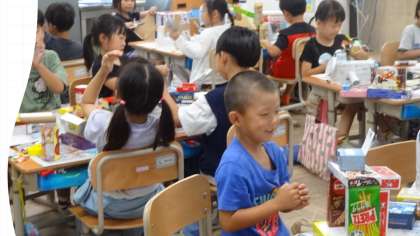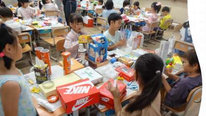 図画工作科〜はこでつくったよ〜の学習では、箱をつんだり、ならべたりして何に見えるかなと想像しました。「動物や虫にみえる」「乗り物や建物にもみえる」と想像を広げていました。作っているうちに箱を切ったり、つぶしたりして工夫する姿も見られました。素敵な作品をはやくお家の人に見てほしいと言っていました。