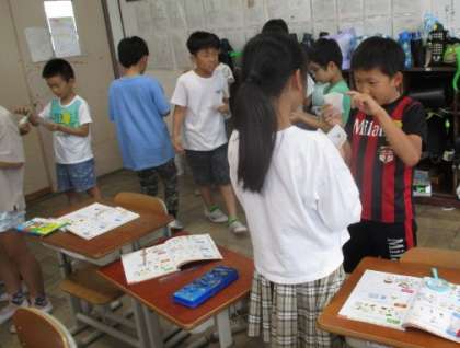 シャッフルゲームや教科書にある聞き取りでひとしきり盛り上がった後、Chantの「I like blue」に挑戦。いつもの通り、「速い!」「もう少しゆっくり!」という声が上がります。何とか歌ってみようと意欲的ですね。