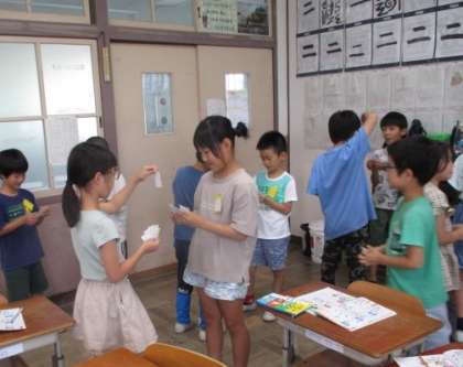 次は、カード・ディスティニー・ゲーム。お互いが持っているカードをひき合い、そのカードに示されたものを好きかそうでないかをやり取りするゲームです。ただ「I like ○○.」と言っているだけでは面白くない。相手とのやり取りを楽しむゲームですから、相手が言ったことに対してどのように反応するかが大事です。今まで学習してきた内容から、「Good!」や「Me too.」と言い返すと気持ちがいい、という考えが出て、再開です。より笑顔が広がった感じがしますね。