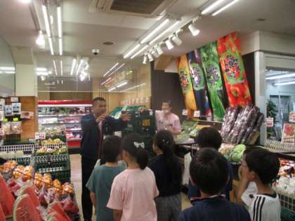 「ふだん見られないお店の仕組みが見られるかな。」「何があるんやろ。」わくわくしながら、クラスごとにA-coop岩倉店を見学させていただきました。