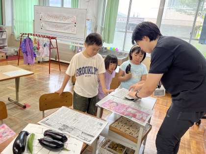 7月2日(火)の様子です。畑の野菜がどんどん育ってきています。子ども達は、収穫できる野菜を良く見極めて、はさみを使って上手に収穫しています。収穫した野菜は、去年の高学年が行っていたあみだくじを受け継ぎ、みんなで仲良く持ち帰る野菜を決めています。子ども達が一生懸命育てた野菜ですので、持ち帰った際は、是非、ご家でお召し上がりください。
