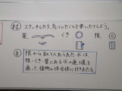 根から取り入れた水はどうなっているのかという疑問から学習を進めていきました。よく見ると根,茎,葉には水の通り道があるのに気づきました。調べてみると面白い発見がたくさんありますね。