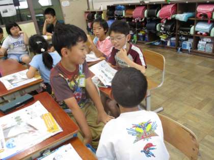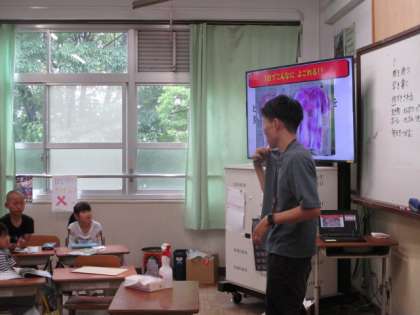 「どのくらいよごれているのかな。」次の瞬間、画像は切り替わり、「え〜!」という絶叫が教室に響き渡りました。シャツがどのくらい汚れているのか、着色した画像です。子ども達が思っているよりも数段汚れが確認できたようで、そういうシャツを着ていることを実感したようでした。