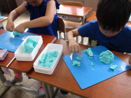 久しぶりの油粘土。バラバラになって保管されていた粘土を一つのかたまりにするところから始まります。子どもはこういう感覚が好きなのでしょうね。そういえば、今でも泥団子を作っている子もいますので、そのような感覚に似ているのかもしれません。