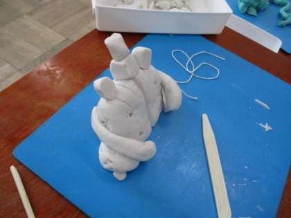 一つになったら、次は道具を使っての作業。今回は、糸を使って粘土を切ります。意外とまっすぐに切れることに気が付き、その面白さを体感しています。粘土を意図できる作業は、陶工の作業にもあります。分厚い粘土を糸で切り、お皿のような状態にする作業です。いつかそのような体験いた時に、このようなことをしたと思い出すかもしれませんね。そして、粘土ベラや割りばしなどを使って、粘土をかきだす作業もします。そろそろ意図したものの形に近付いてきます。かきだしたものをくっつけて、自分の考えたものに仕上げていきます。表面を滑らかにしていくと、何となくその形が見えてきます。みんなは何をイメージしていたのかな。